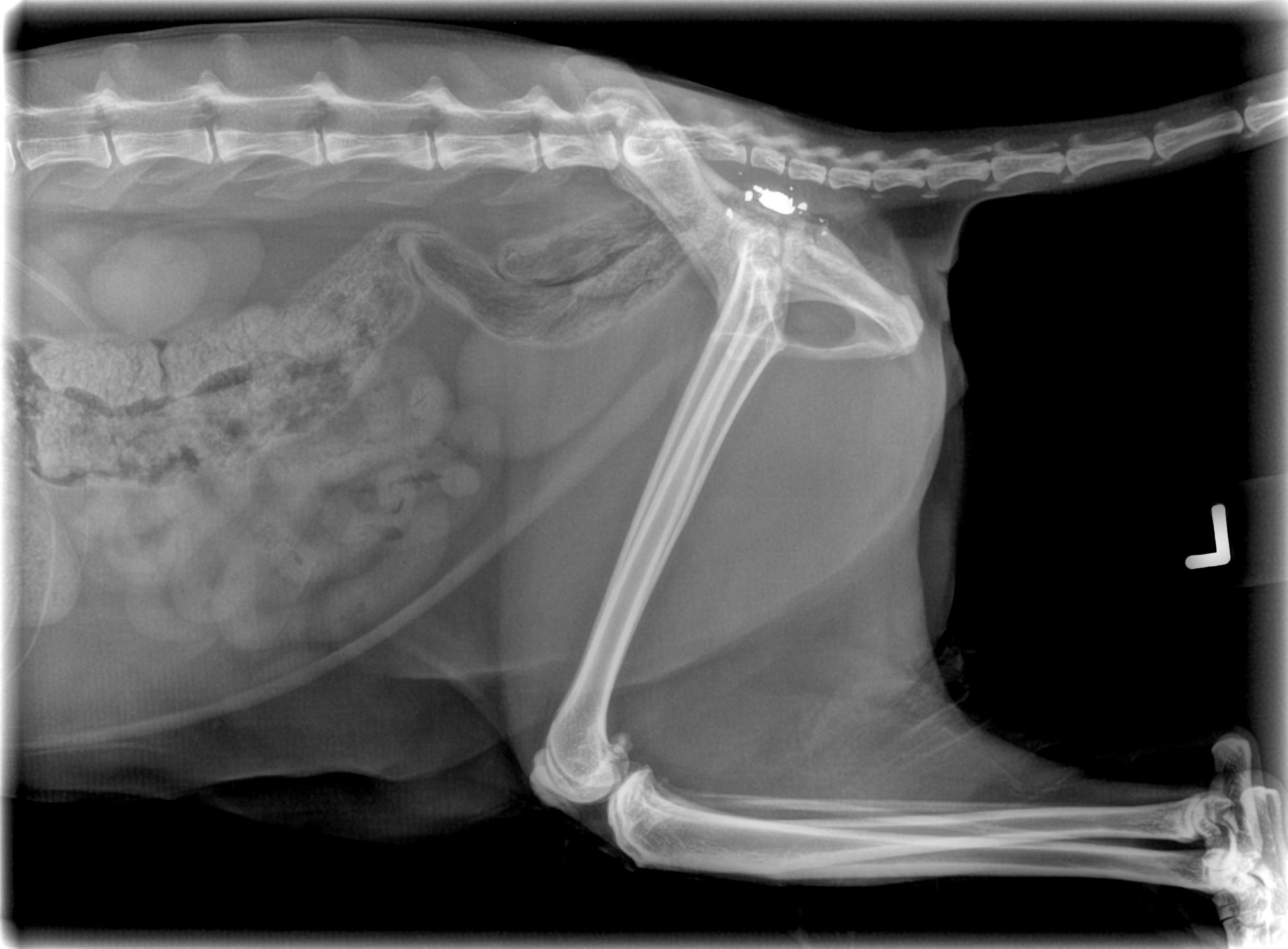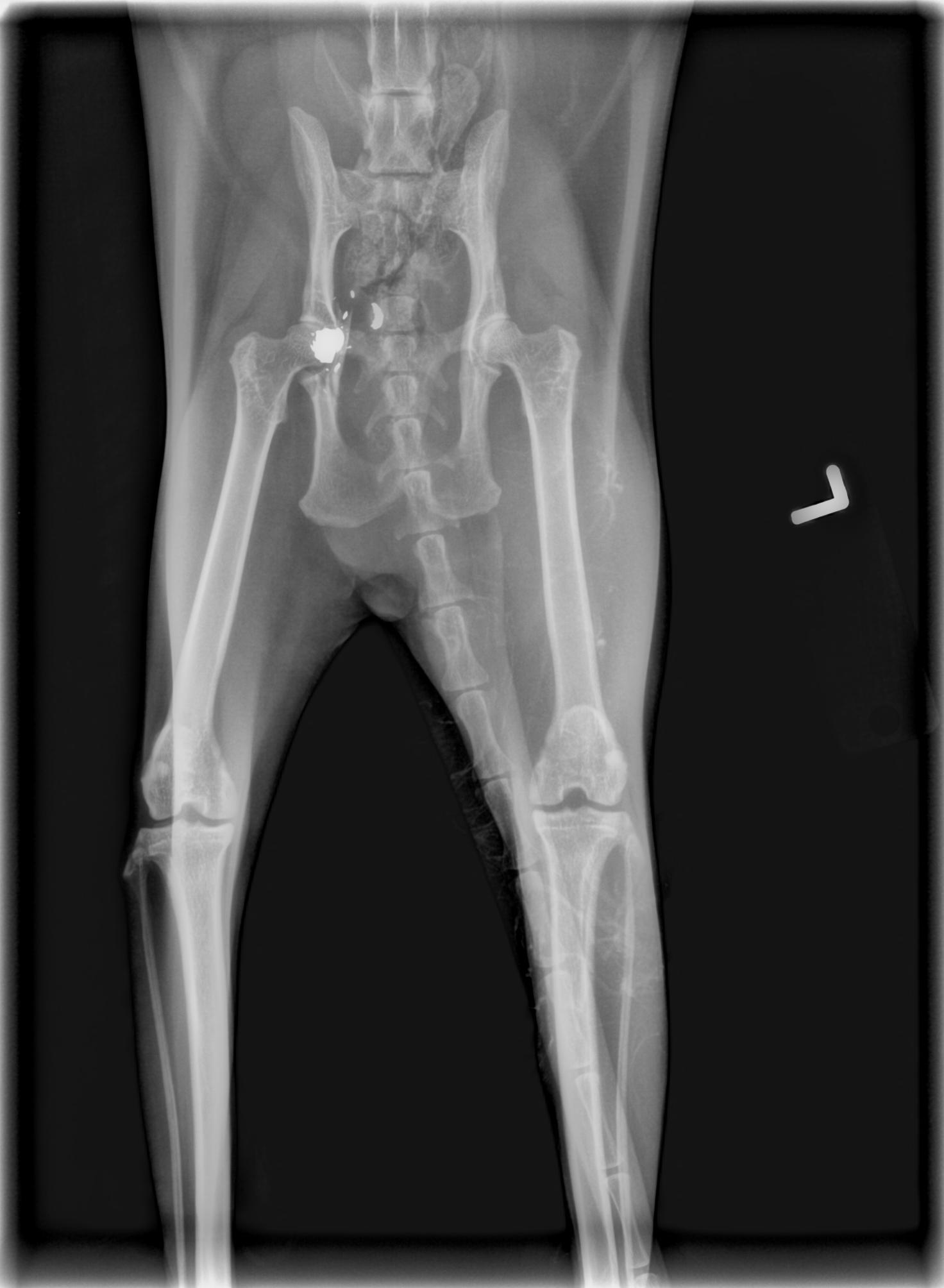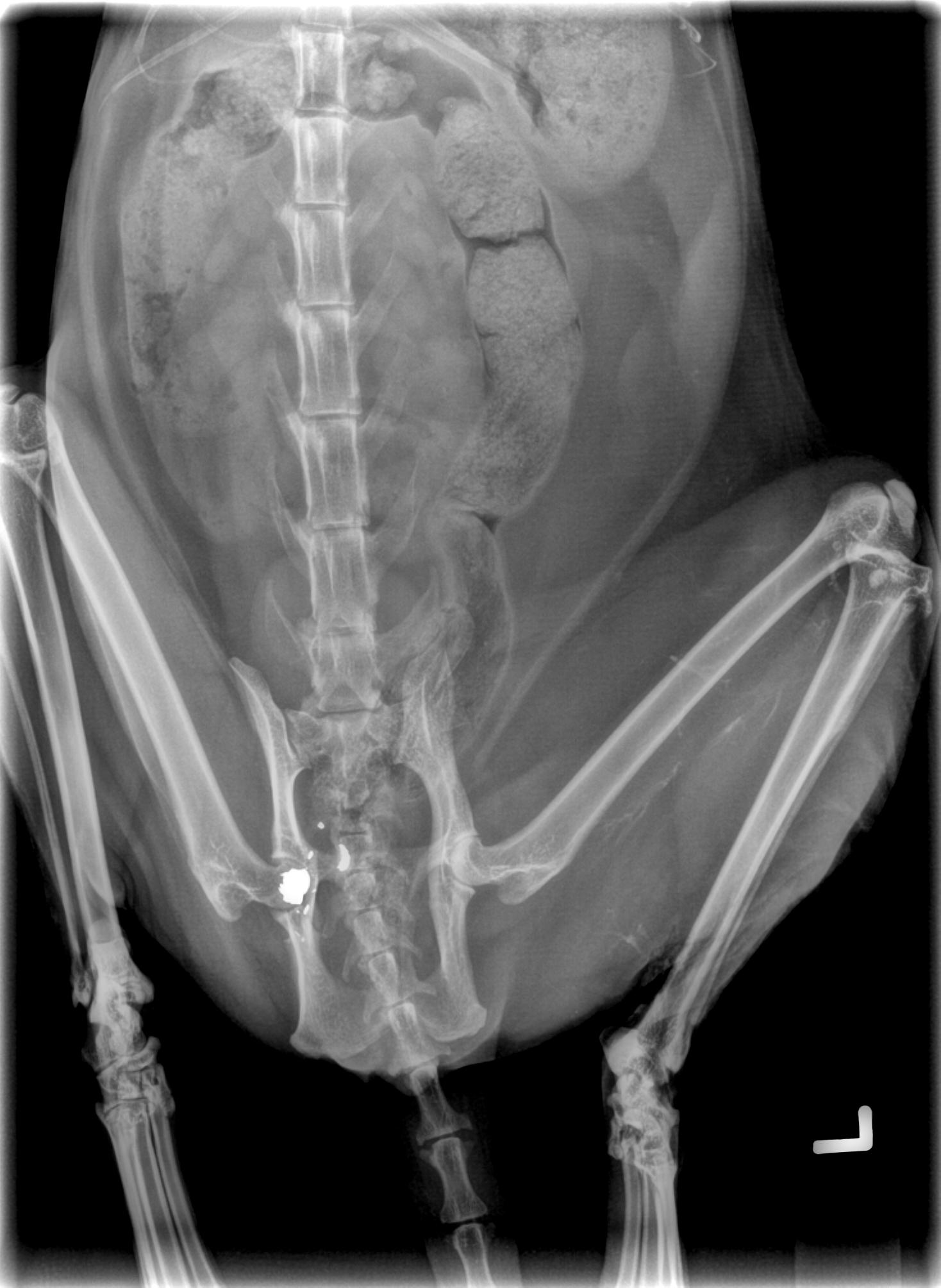 Pelvis cracked by impact of round, and you can see where some of it is way too close to the spinal column to go digging around.