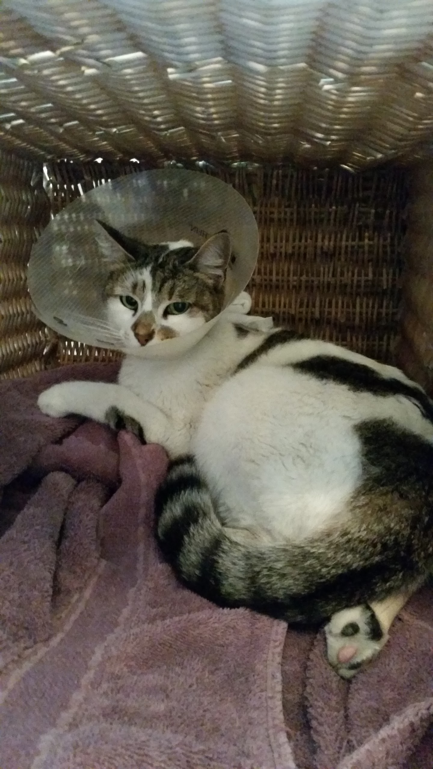 Kita got a kitteh 2 week pain patch and a Cone of Shame.