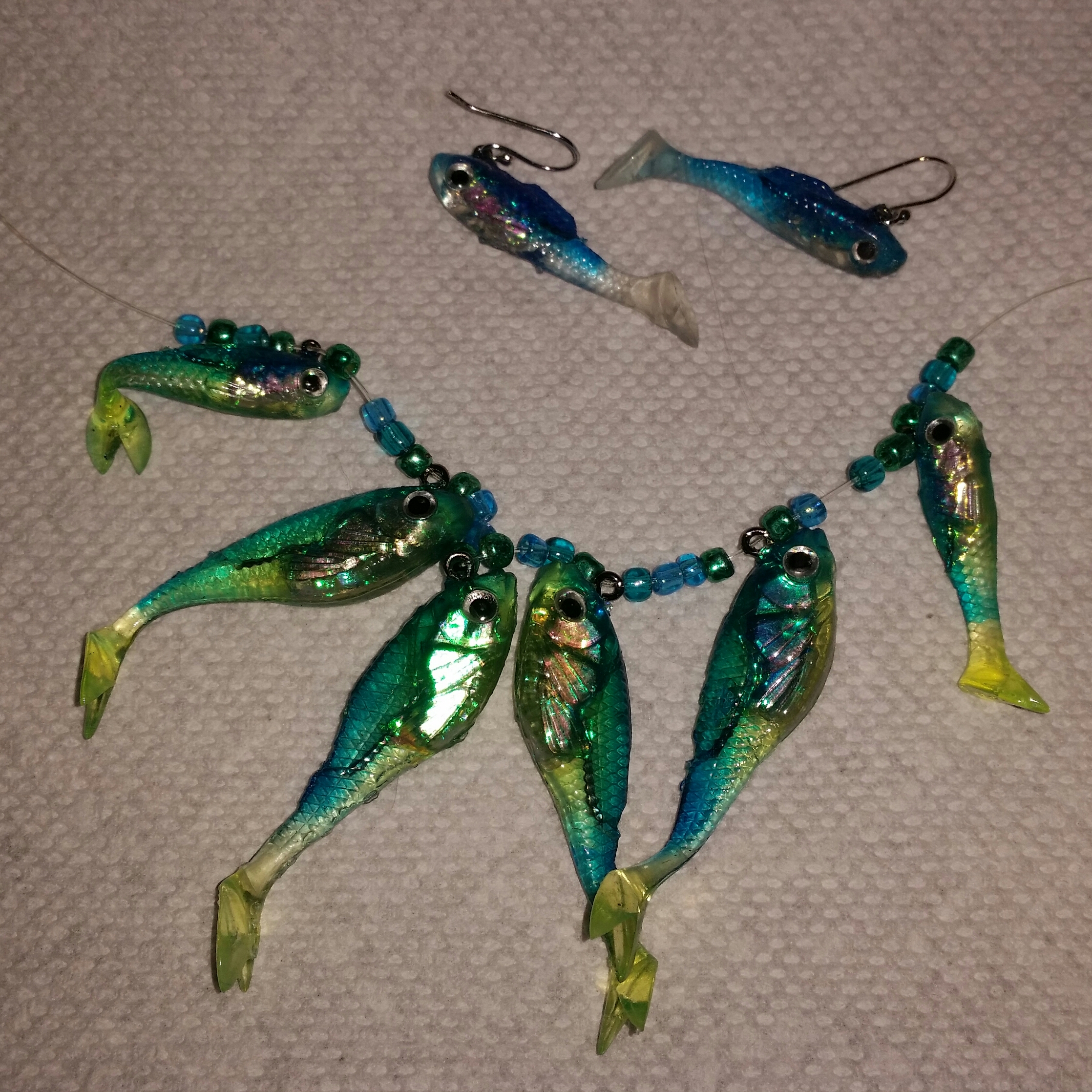 2.) Clip off fish hook close to body, attach to earring hook/string fish on cord with beads.