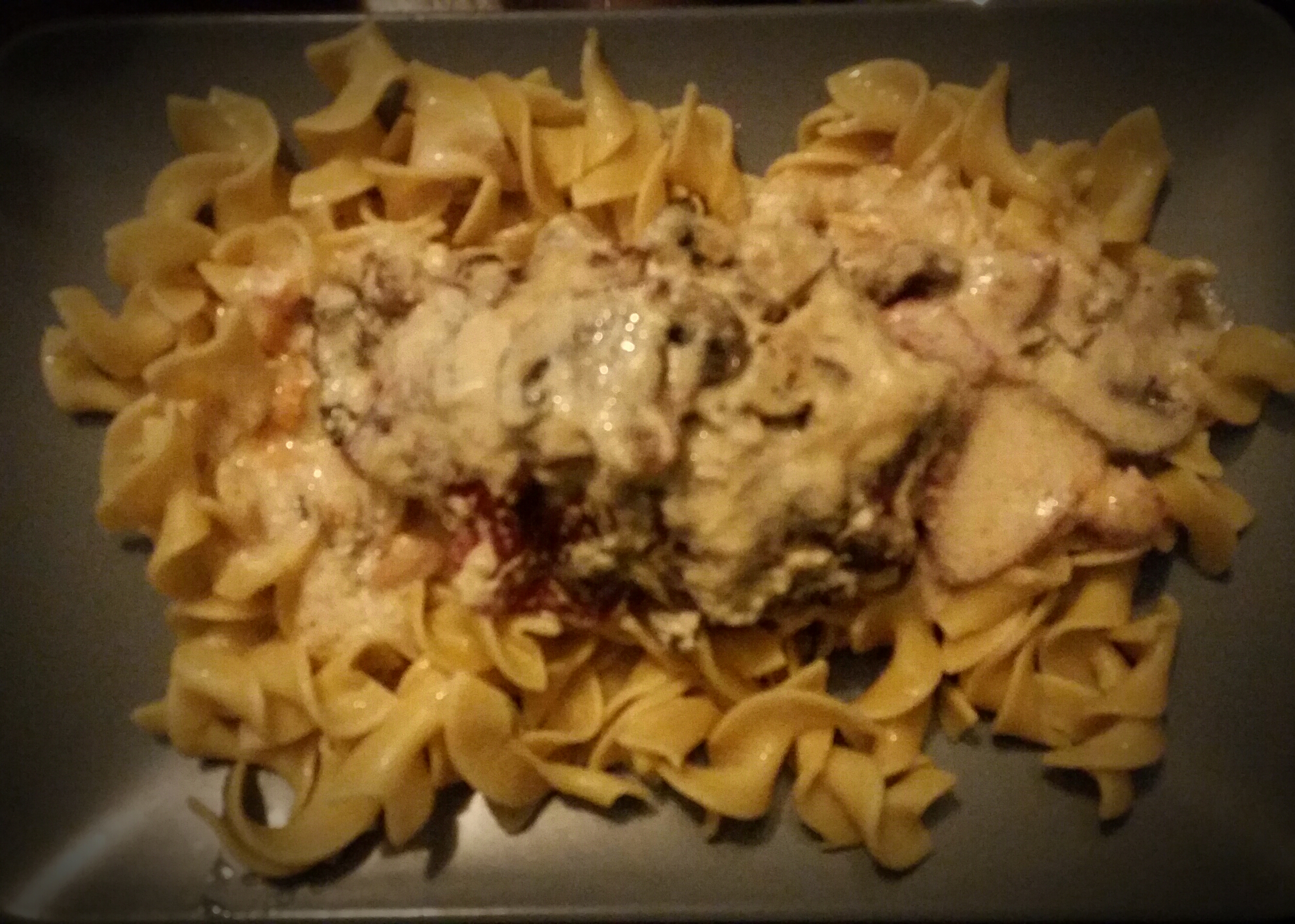 On a bed of buttered egg noodles.