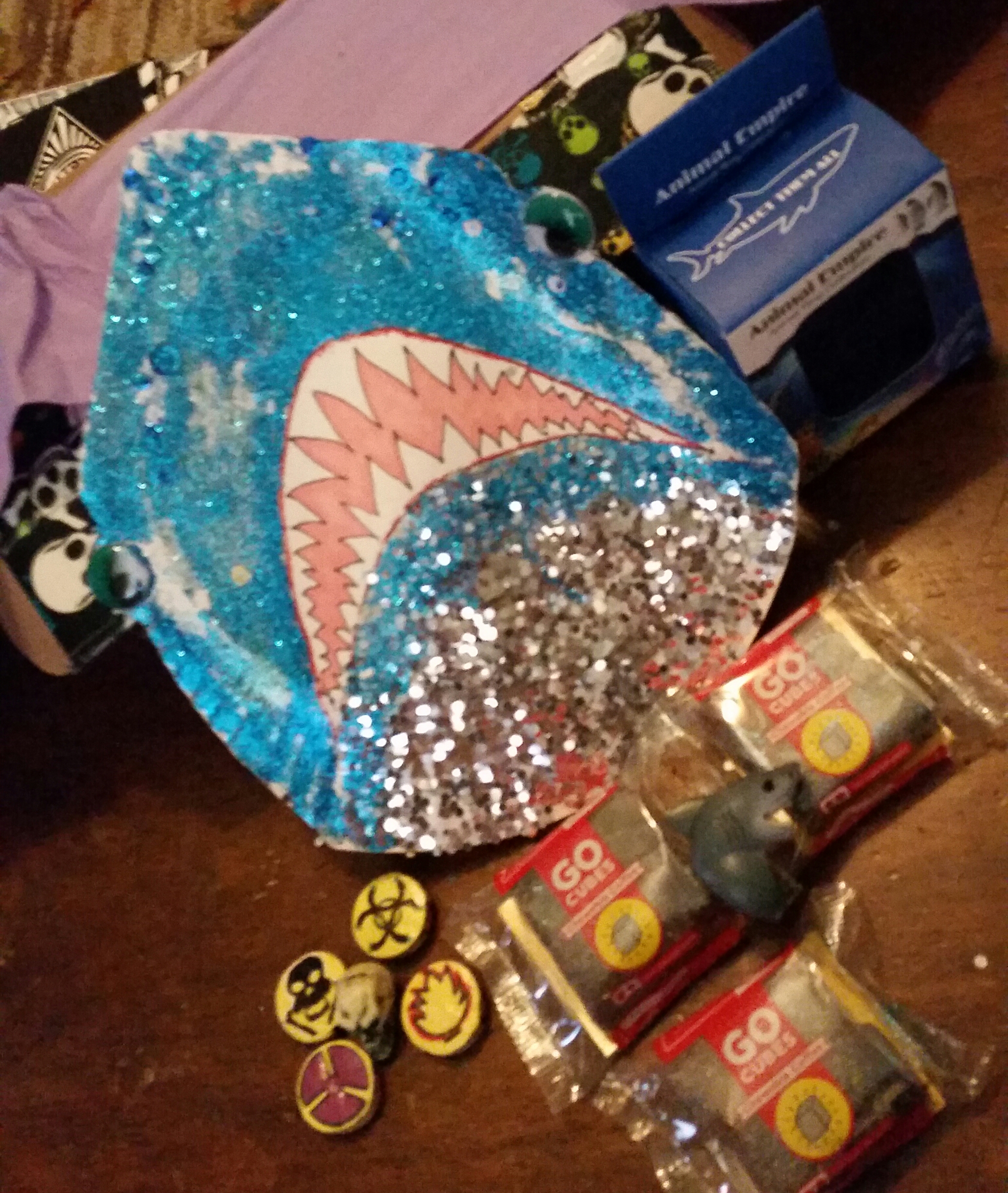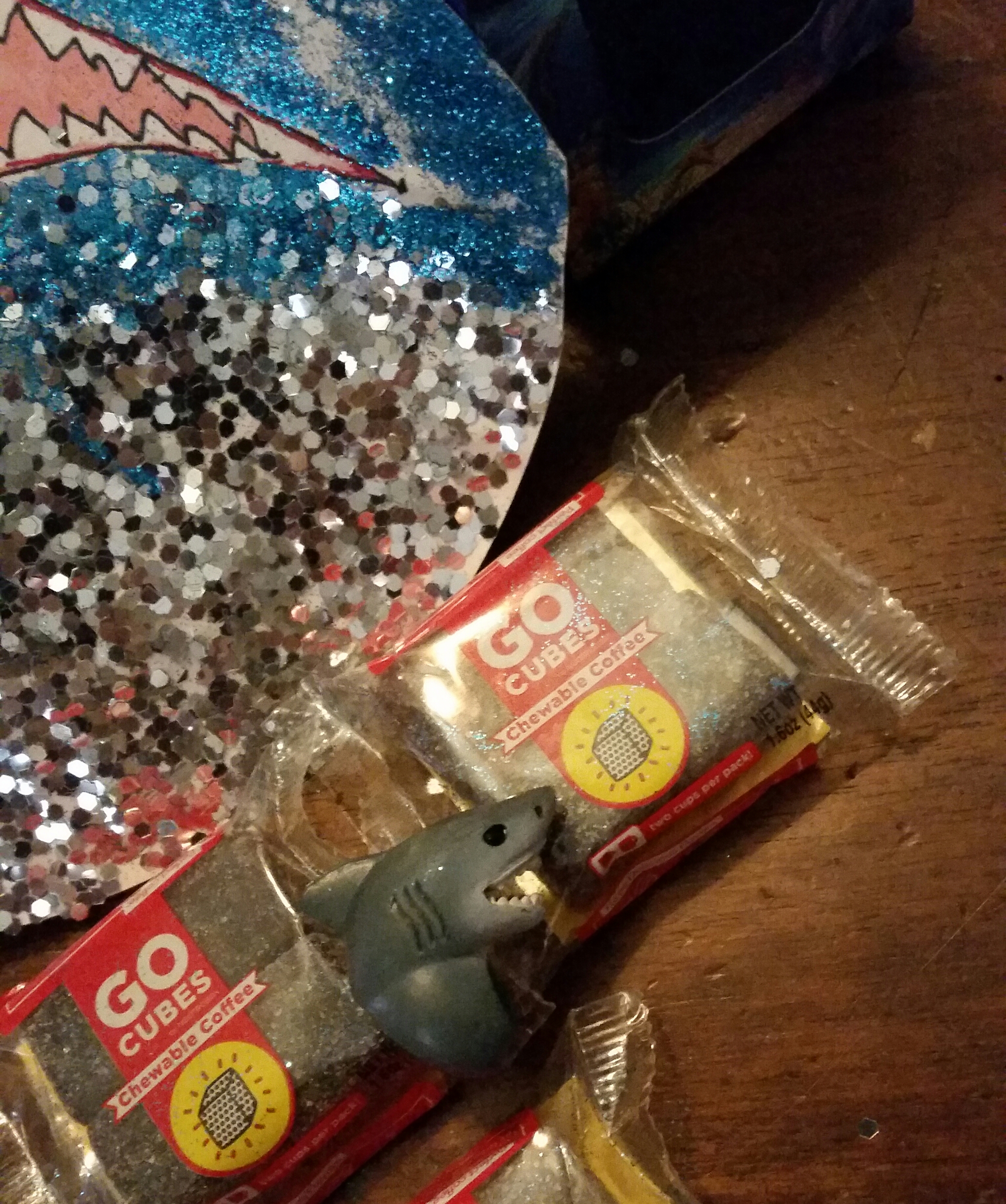 Glitter shark, jawsome shark ring, mini skull, coffee chewies, and cool magnets.